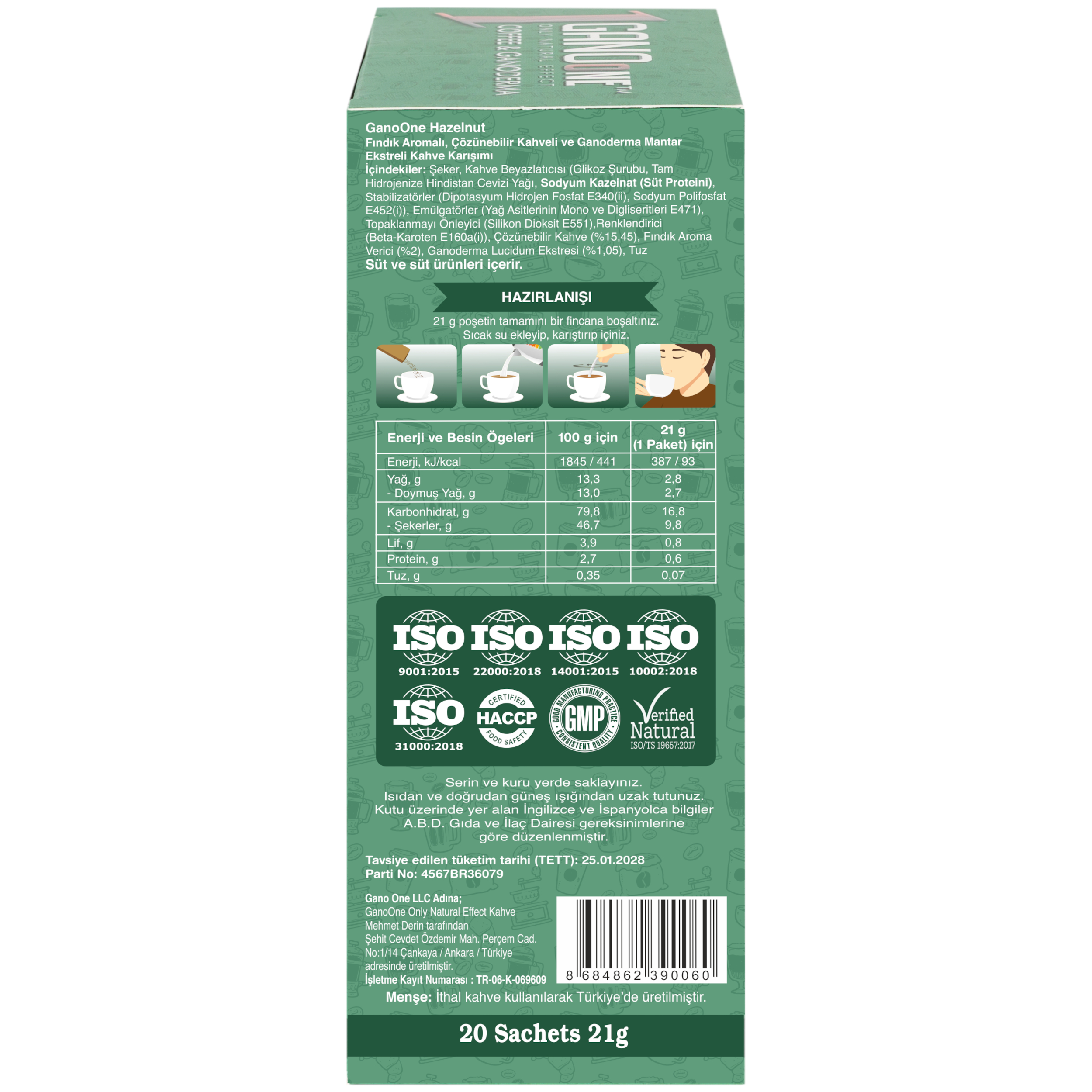 Her bir kutu 21g x 20 poşet kahve karışımı içerir.