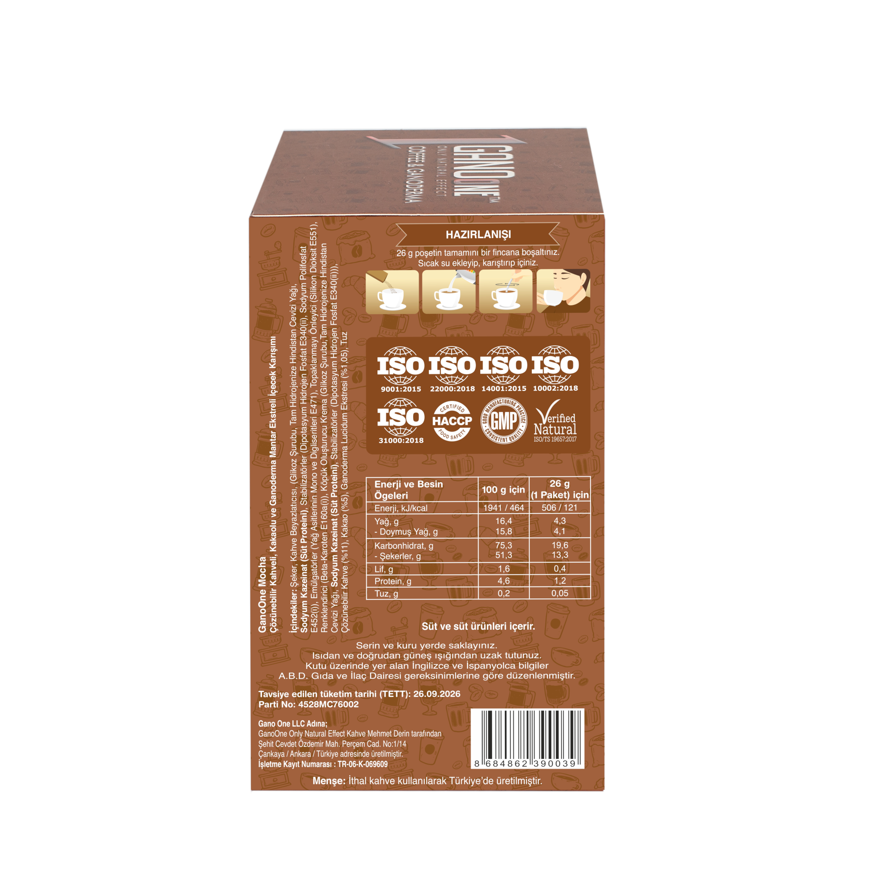 GanoOne Mocha yumuşak ve kremalı bir deneyim sunuyor. Kahve, kakao ve Ganoderma ekstresinin özenle hazırlanmış uyumu ile ortaya çıkan eşsiz tat ile tanışın. Her yudumda GanoOne Mocha’nın lezzetini keşfedin!